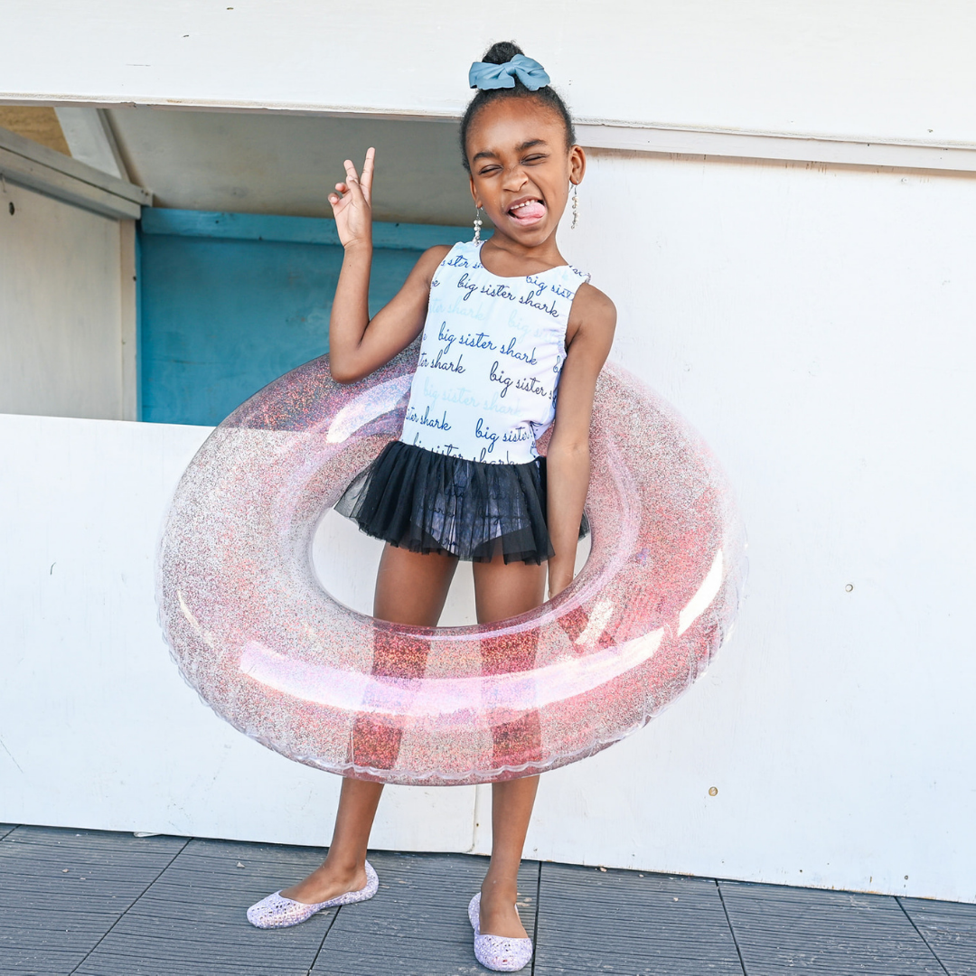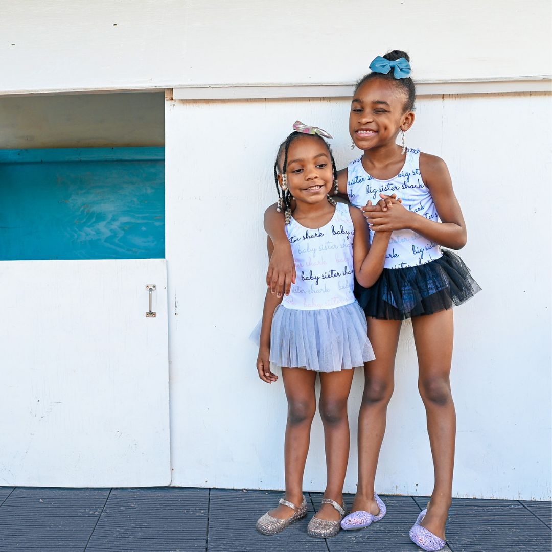 -A fully lined swim + tumble tutude featuring a personalized color text bodice with white background.