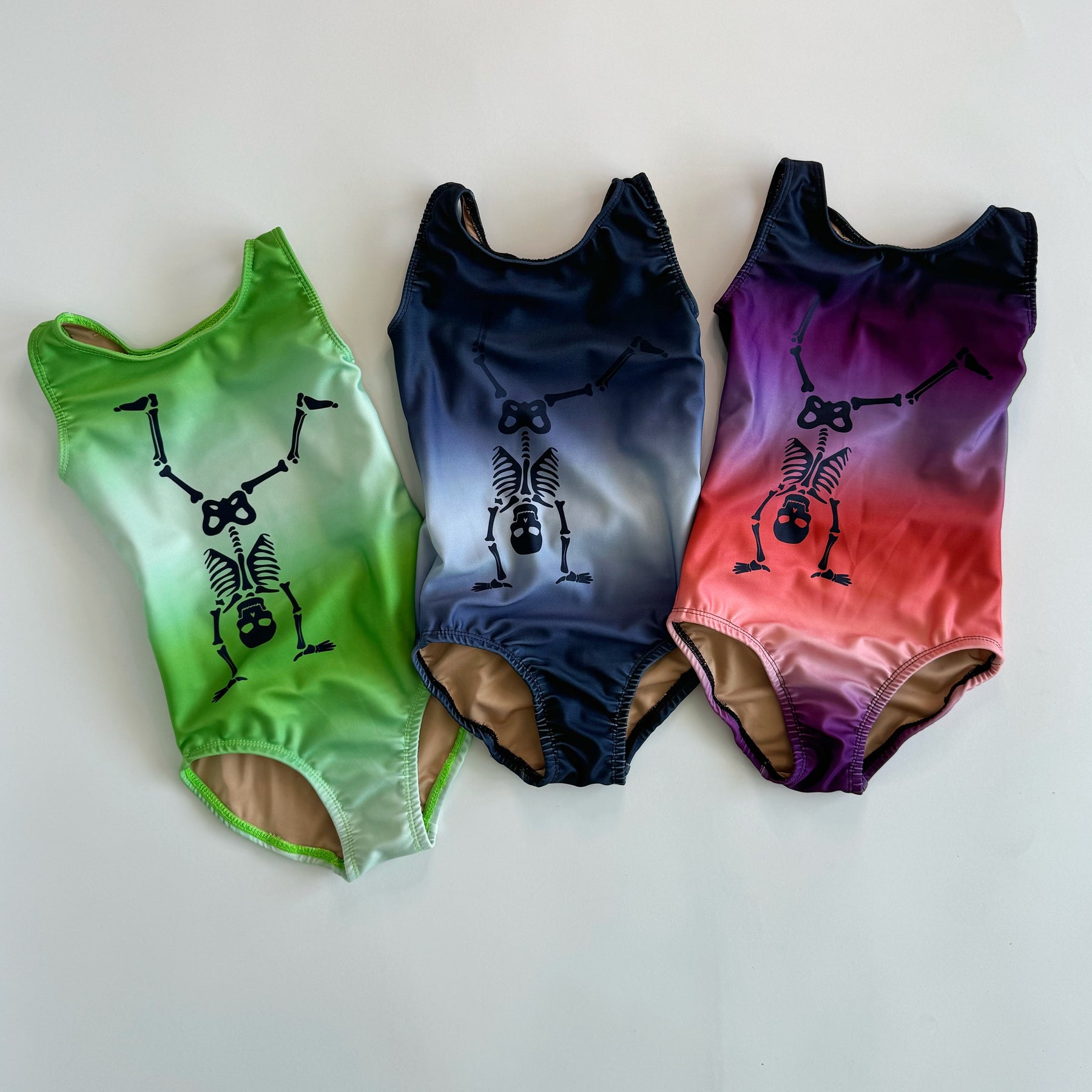 Our fully lined leotard base using swim fabric making this an ultra high quality, extra durable practice leo for tumbling and doubling as a summer swimmie. Pick your favorite halloween color. we will add the tumbling skeleton to your choice of bodice and sleeves, sew it up and ship it asap.