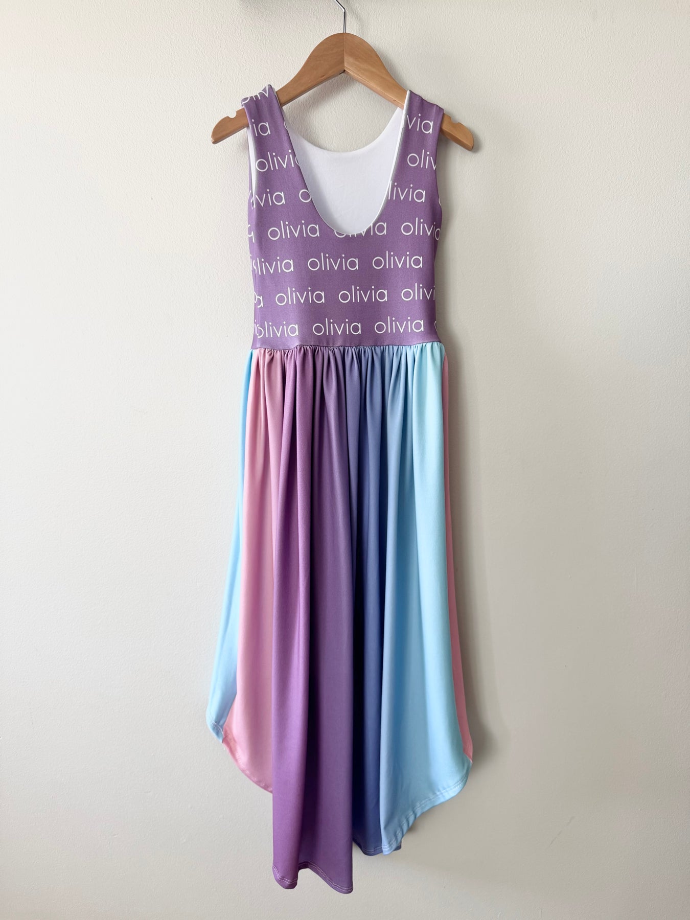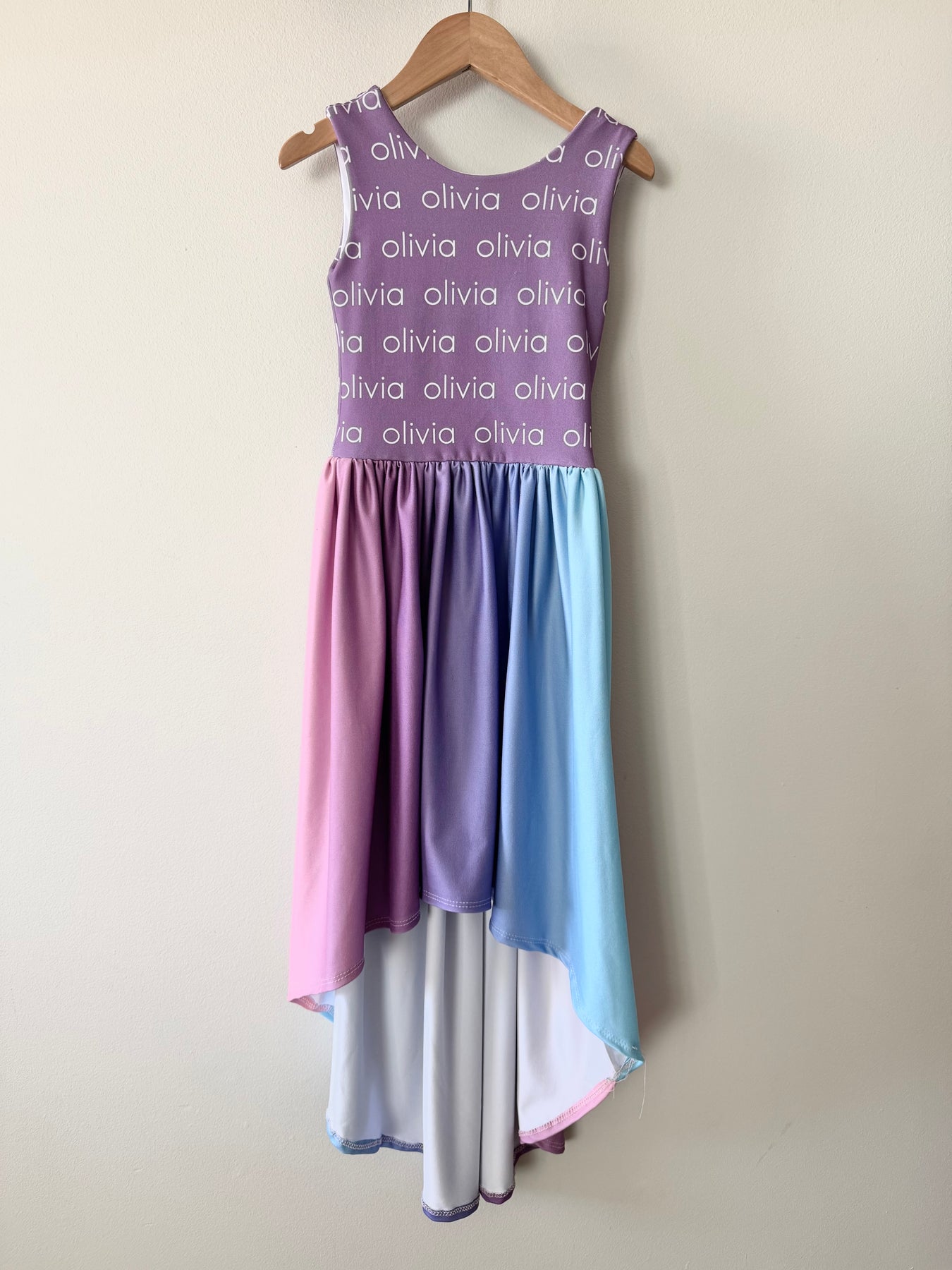 -Personalized hi low twirl dress with white writing. As with all digital portrayal and single item batch printing, please be aware that colors may appear different in person as you see on screen and may differ from previous orders. We do not guarantee exact matches.