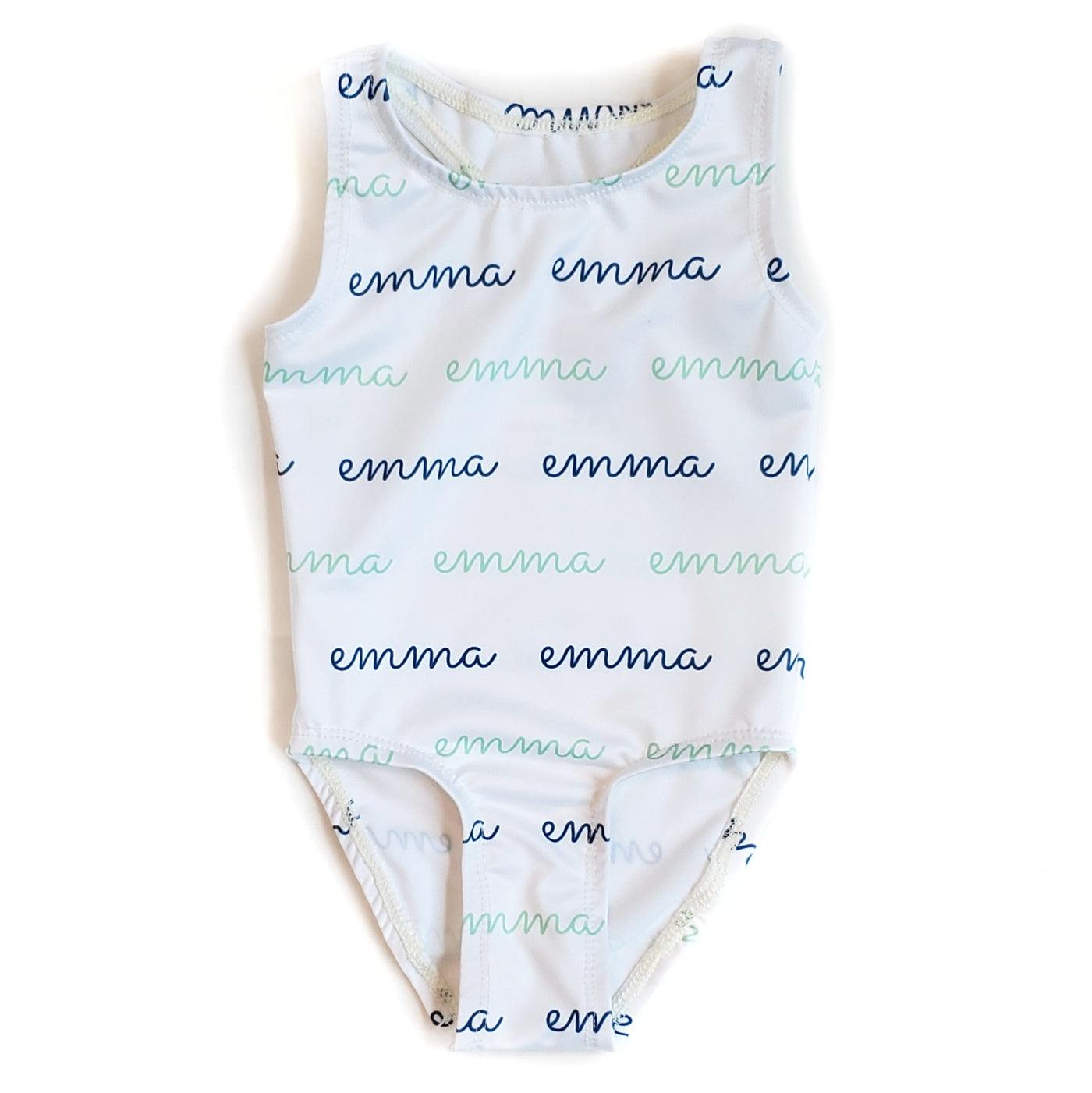 -Personalized bodice with colored writing. Swimsuit background in white.